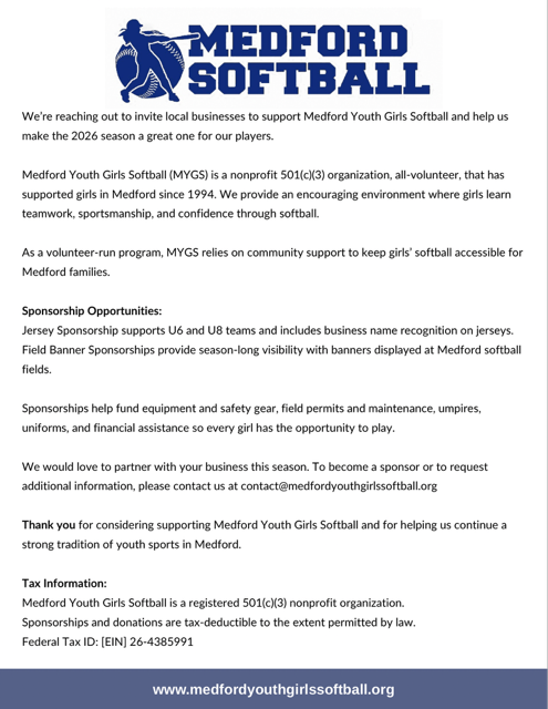 Your support makes a difference! If you're interested in sponsoring or have any questions, please contact us at contact@medfordyouthgirlssoftball.org.